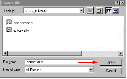 With notice~alibi selected (note file name appears in the File name box), CLICK on the OPEN button in the lower right corner of the file directory box (see red arrow). |